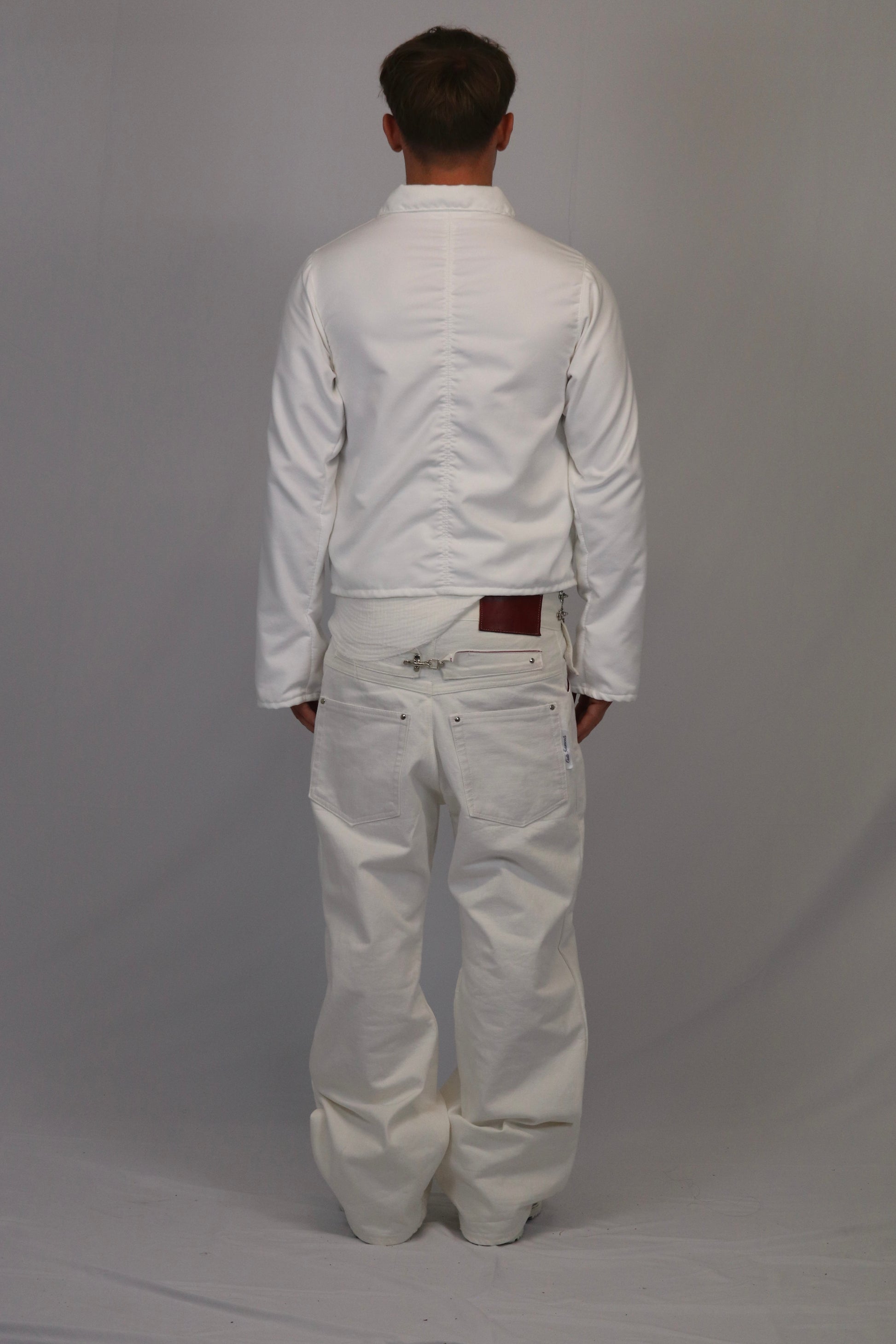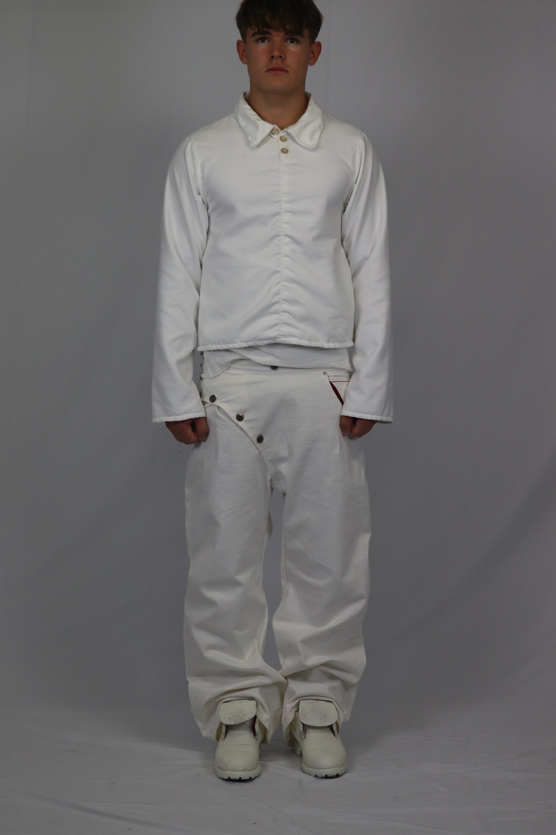 Handmade with a very soft material, this shirt features, winkled seams on the front and the back, white gold buttons on a basic collar. It has a slim cropped fit with slim bootcut sleeves and an opening on the top.