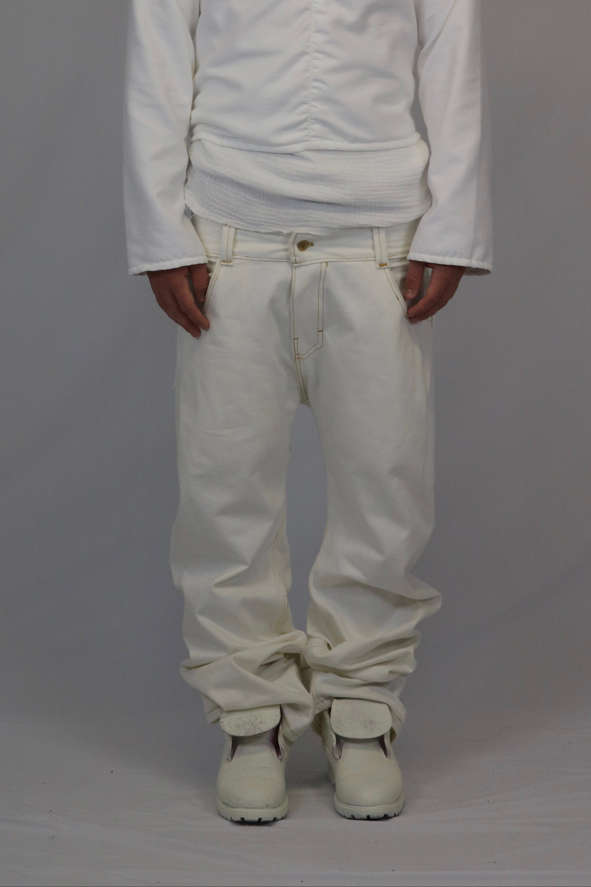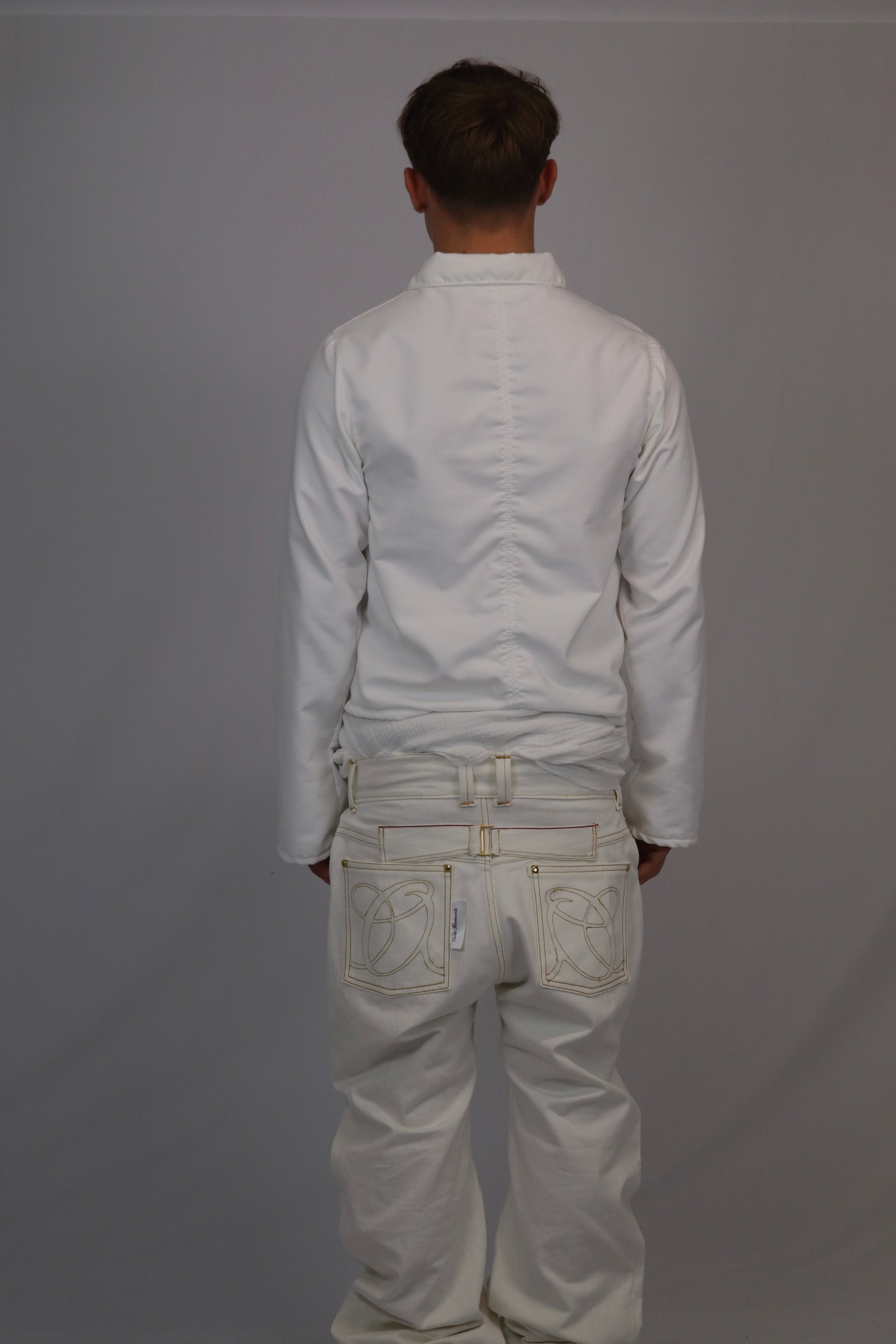Handmade with an 11oz selvedge denim from Italy, these pants have gold details all around, stitches, buttons, buckle and YKK zipper. Handsewn pocket designs on the back matching the details. It has a regular straight leg fit, that stacks perfectly.