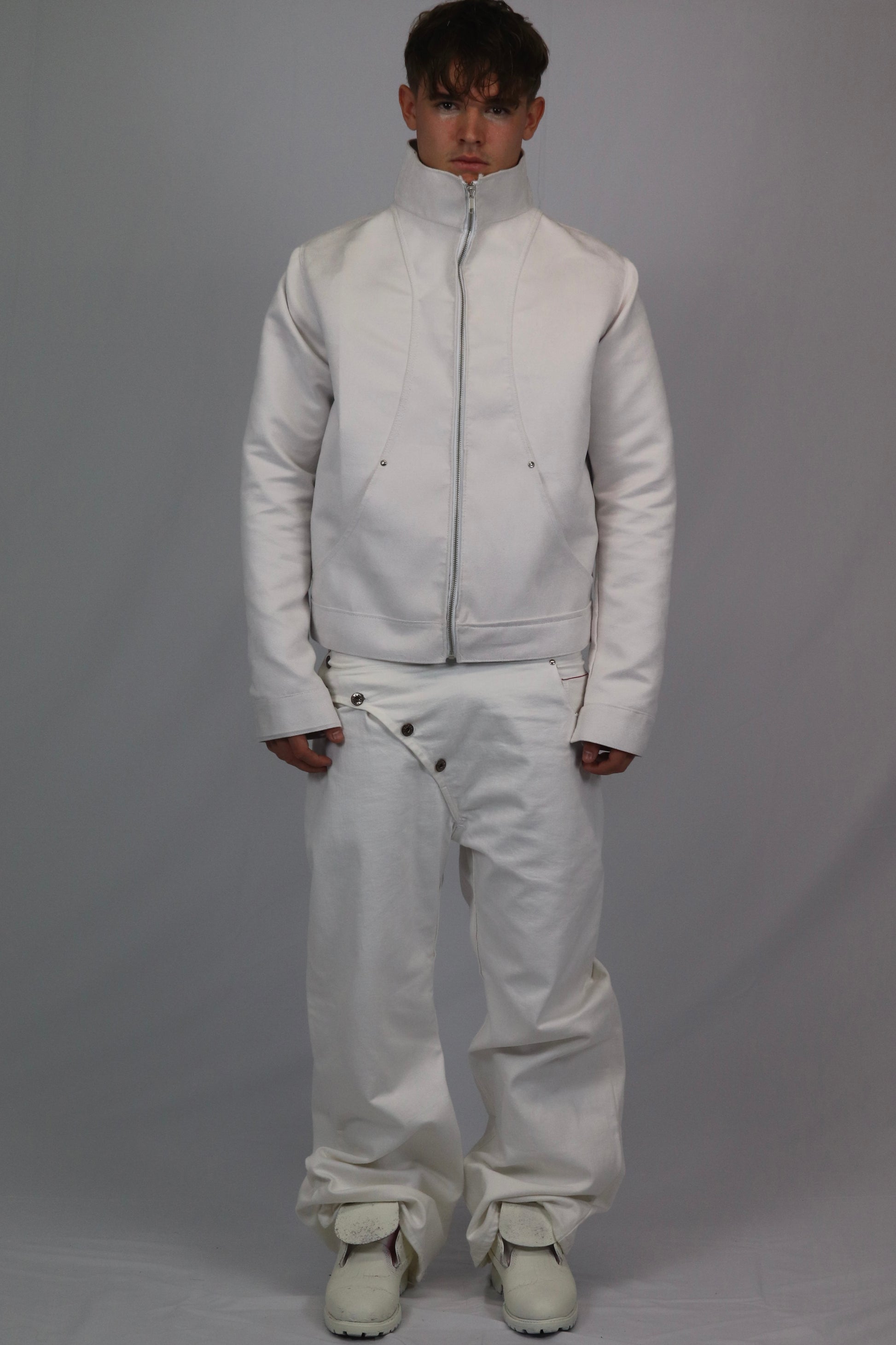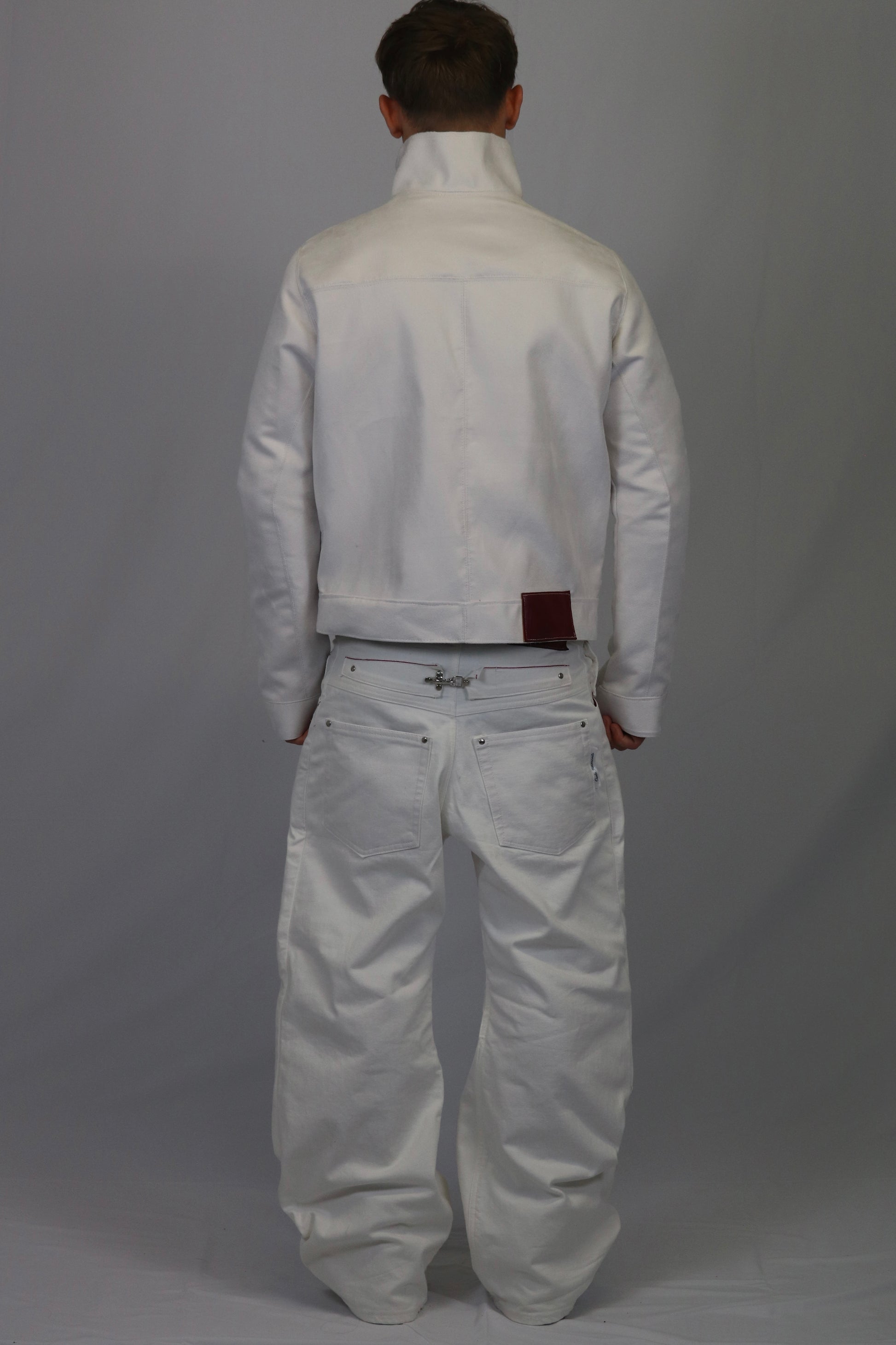 Handmade with a faux suede fabric from Italy and a red silk lining, this jacket features some silver rivets, a YKK zipper, and two big pockets on the front, it has a red leather patch on the waistband matching the interior. The fit is regular with a wide collar and fitted sleeves.